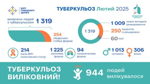 У лютому 2025 року в Україні зареєстровано 1319 людей з туберкульозом (ТБ): 1009 нових випадків захворювання; 250 пацієнтів із рецидивом; 60 — інші (серед них: люди, які відновили лікування; пацієнти після невдалого курсу лікування; пацієнтиЧитати далі